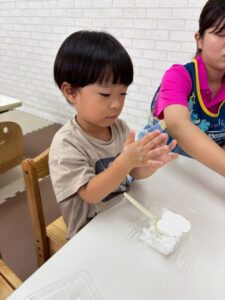 2歳児さんは重曹とボンドを混ぜて本物のおもちのようにこねました!