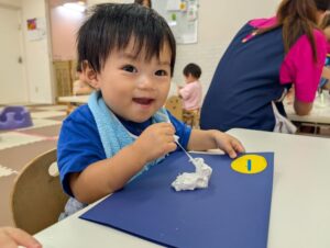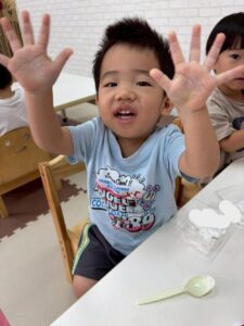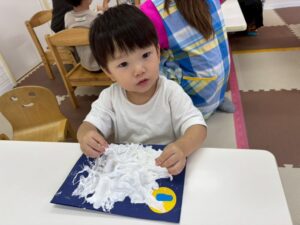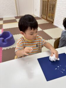 0歳児、1歳児さんは粘土をコネコネしたり、画用紙にダイナミックにぺったんしたりして楽しみましたよ。