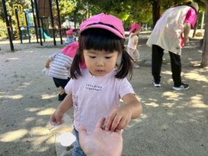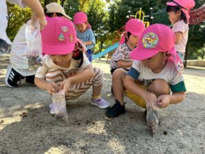 0,1歳児さんは橋波西公園に行ってボールやシャボン玉で遊んだり、虫や葉っぱを見つけて触ったりして楽しみました。