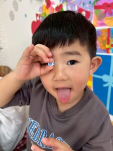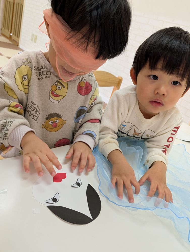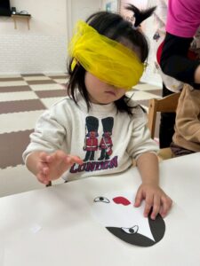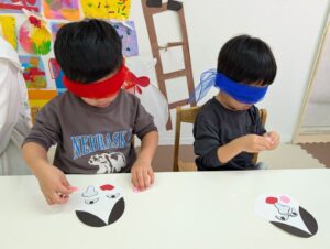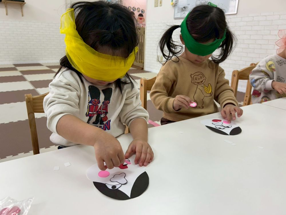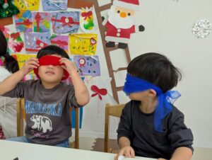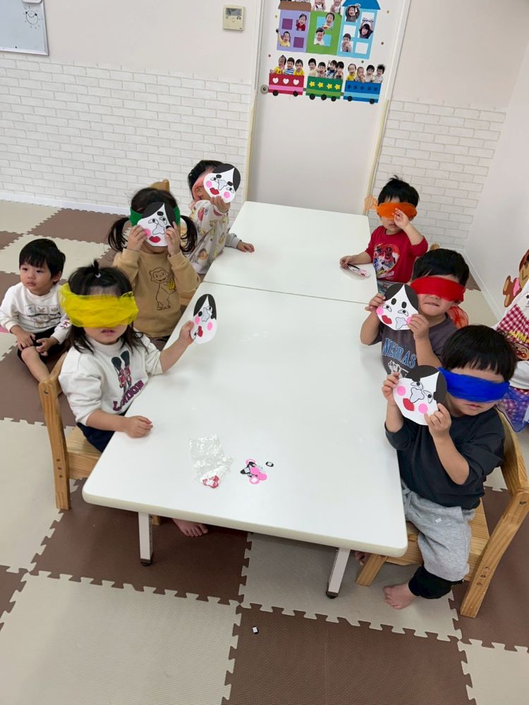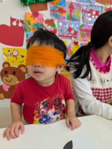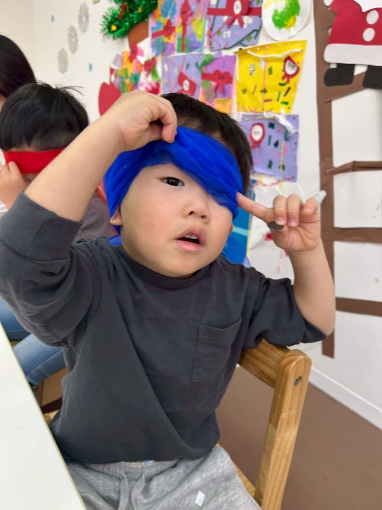 目隠しを怖がることはなく、「見えにくーい!」「赤く見えるー!」「目がピンクだよー!」と大盛り上がり🌟