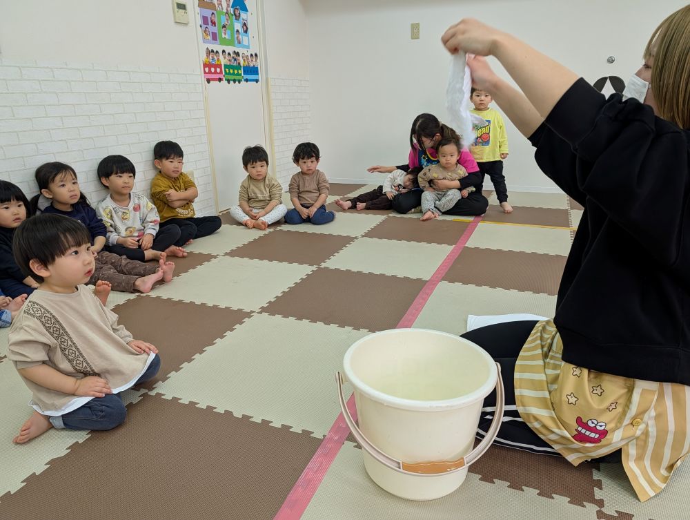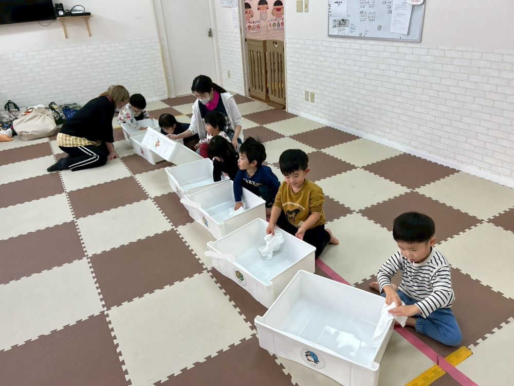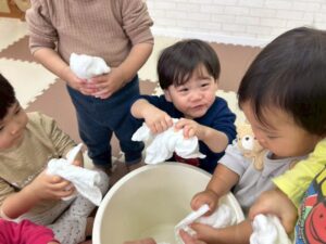 雑巾の絞り方や掃除の仕方を伝えると、夢中な様子の子ども達!