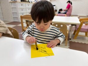 1歳児さんはクレヨンや絵の具の扱いに慣れてきて、スイスイ~っと思うがままに表現していました!