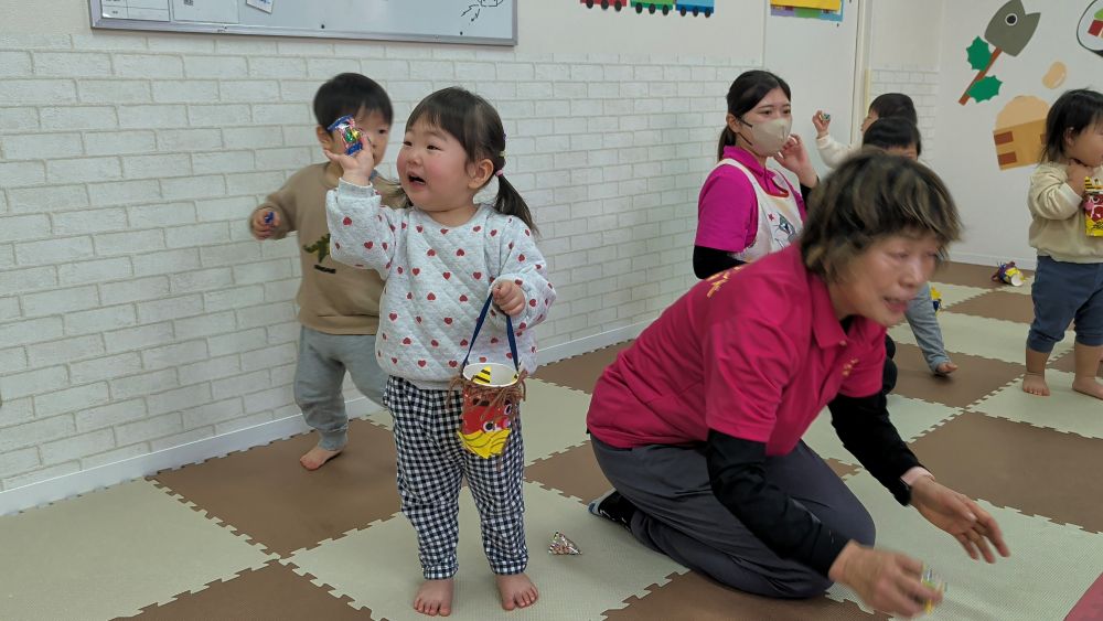 0・1歳児さんは不思議そうでしたが、保育士が豆まきを伝えると、鬼に果敢に立ち向かっていました!