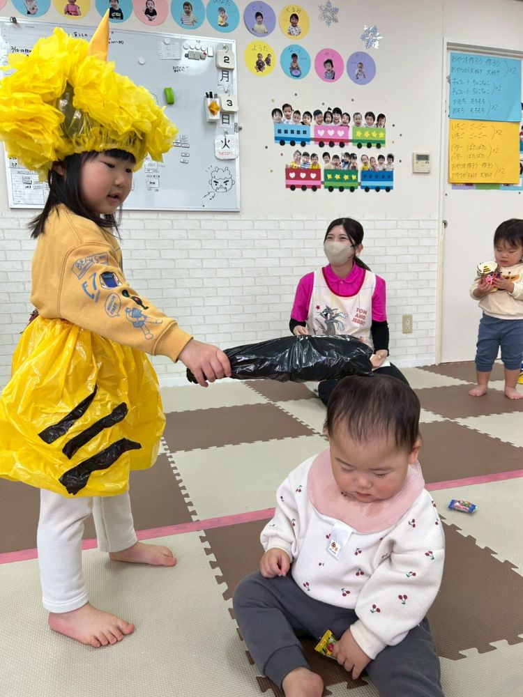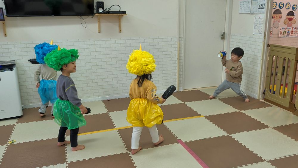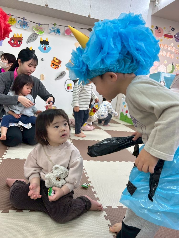 2歳児さんは「ガオー!!」と怖い顔をしたり、金棒でツンツンしたりと、鬼になりきって楽しみました👹✨