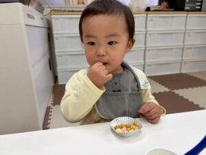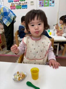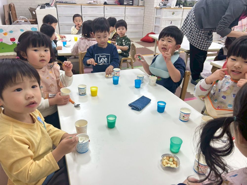 どんな味がするのか、恐る恐る口に入れてみる子もいましたが、美味しいと分かるとパクパク食べていましたよ💕