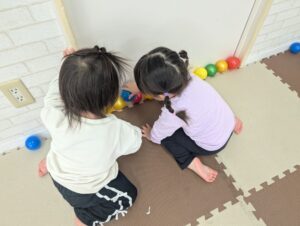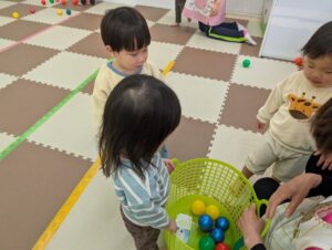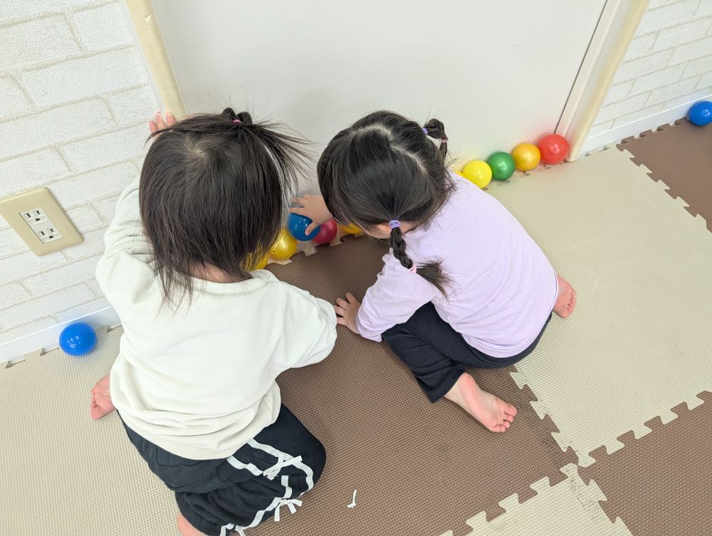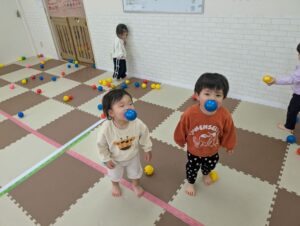 子ども達も新しい環境にドキドキしたと思いますが、お部屋でゆっくり絵本や手遊びを楽しんだり、ボール遊びに夢中になる姿を見せてくれましたよ♪