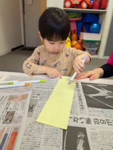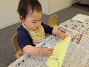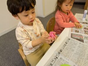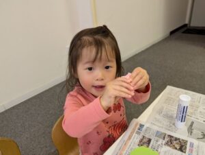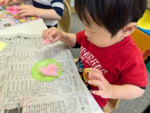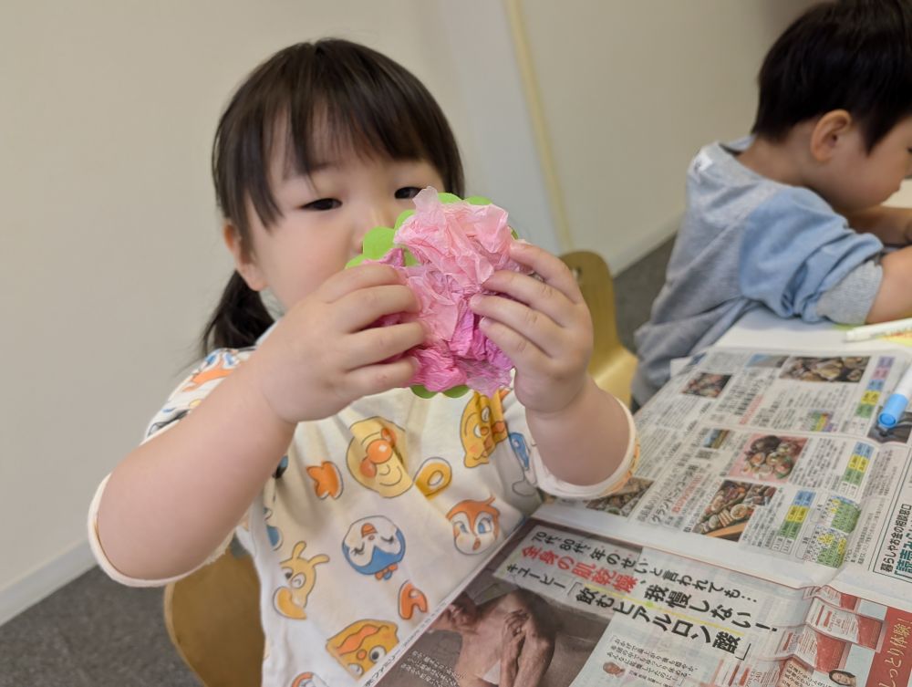 まずは花紙をぎゅっぎゅと丸めました! 皆「おだんご~🍡」と言いながら 手のひらいっぱい使って上手に取り組んでいましたよ✨ 花紙を丸めたら画用紙にのりを付けて貼り付けました! 綺麗なお花が咲きましたね😊🌸 最後にお花を入れる箱にお絵描きをしましたよ! ママはどんな色が好きかな~